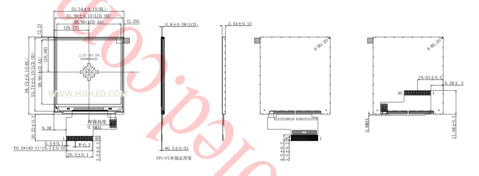 CeÉcran LCD carré de 2,73 poucesprésente une résolution de 320x320 pixels. Il utilise des circuits intégrés de pilote éprouvés et éprouvés dans l'industrie, en particulier le ILI9488 ou le ST7796, et prend en charge les interfaces SPI, MCU et RVB. Aujourd'hui, M. Huang, ingénieur chez Shenzhen Hongjia Technology, est heureux de présenter l'un de nos produits phares : le HJ2730-03. Cet écran de 2,73 pouces est doté d'un connecteur standard à 40 broches, prend en charge les interfaces RVB 16 bits et 18 bits et est piloté par le circuit intégré ILI9488. Il offre une grande fiabilité, des capacités antistatiques exceptionnelles et est équipé d'un rétroéclairage à 6 LED qui émet une lumière blanche pure.